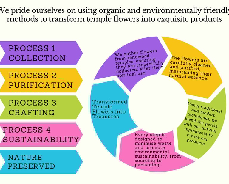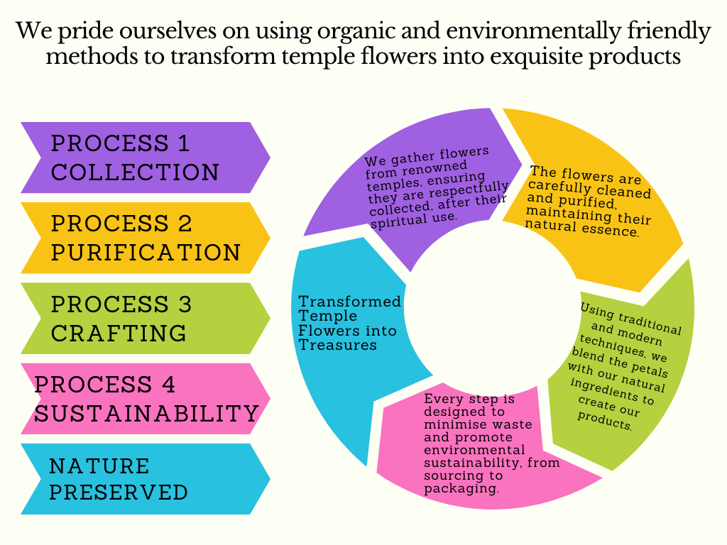 Sustainability: By repurposing temple flowers and using eco-friendly processes, we contribute to a cleaner, greener planet.